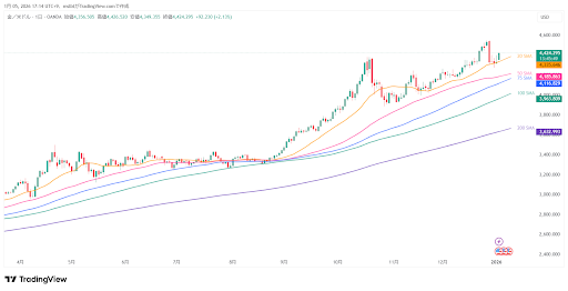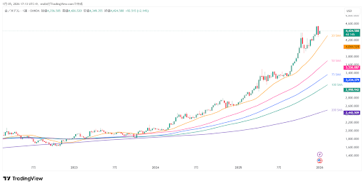 まずは週足チャート[Image 1]をご覧ください。2025年、ゴールドは年間約65%という驚異的な上昇を見せました。これを「バブル」と呼ぶ人もいますが、チャートは嘘をつきません。