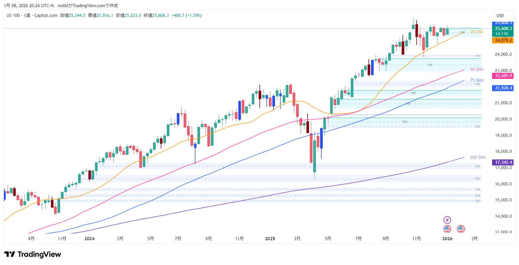 - 高値の切り上げ: 直近の最高値(2025年12月)は、前の戻り高値をきっちり超えています。右肩上がりの強気チャネルの中を綺麗に推移していますね。