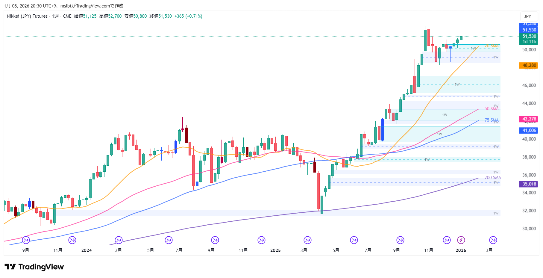 - 高値更新: かつての壁だった4万円、5万円を次々突破。直近では51,160円の上限も明確にブレイクして新高値更新中です。