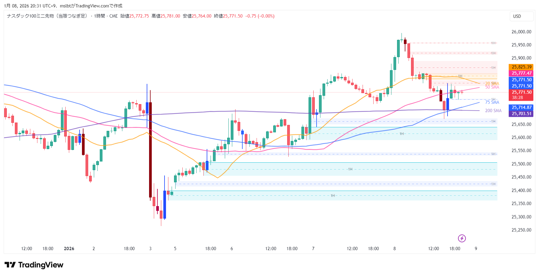 現在価格から300~400ドルほどの調整を待ちます。価格が25,150ドルエリアに突っ込み、一瞬下に抜ける動き(ストップ狩り)を見せた後、1時間足の実体で再度25,150ドルを上回って確定した瞬間。そこがエントリーの合図です。