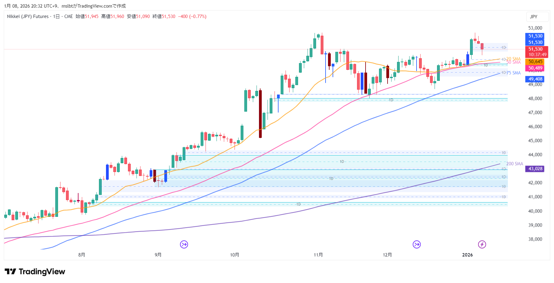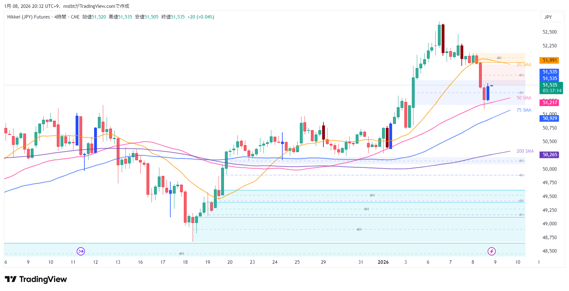 「レジスタンスがサポートに変わる(サポレジ転換)」という基本原則に従えば、51,160円 ~ 51,300円 のゾーンまでの押し目は、絶好の買い場になります。