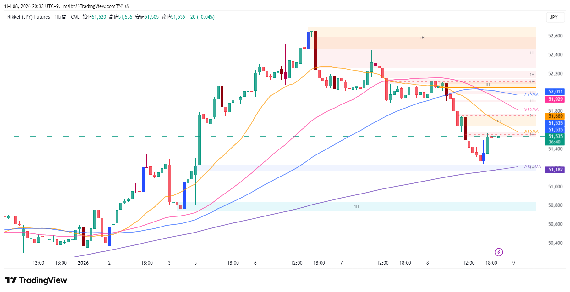 1時間足を見ると、51,500円から急騰した時にできたFVGが 51,400円 ~ 51,600円 に残っています。